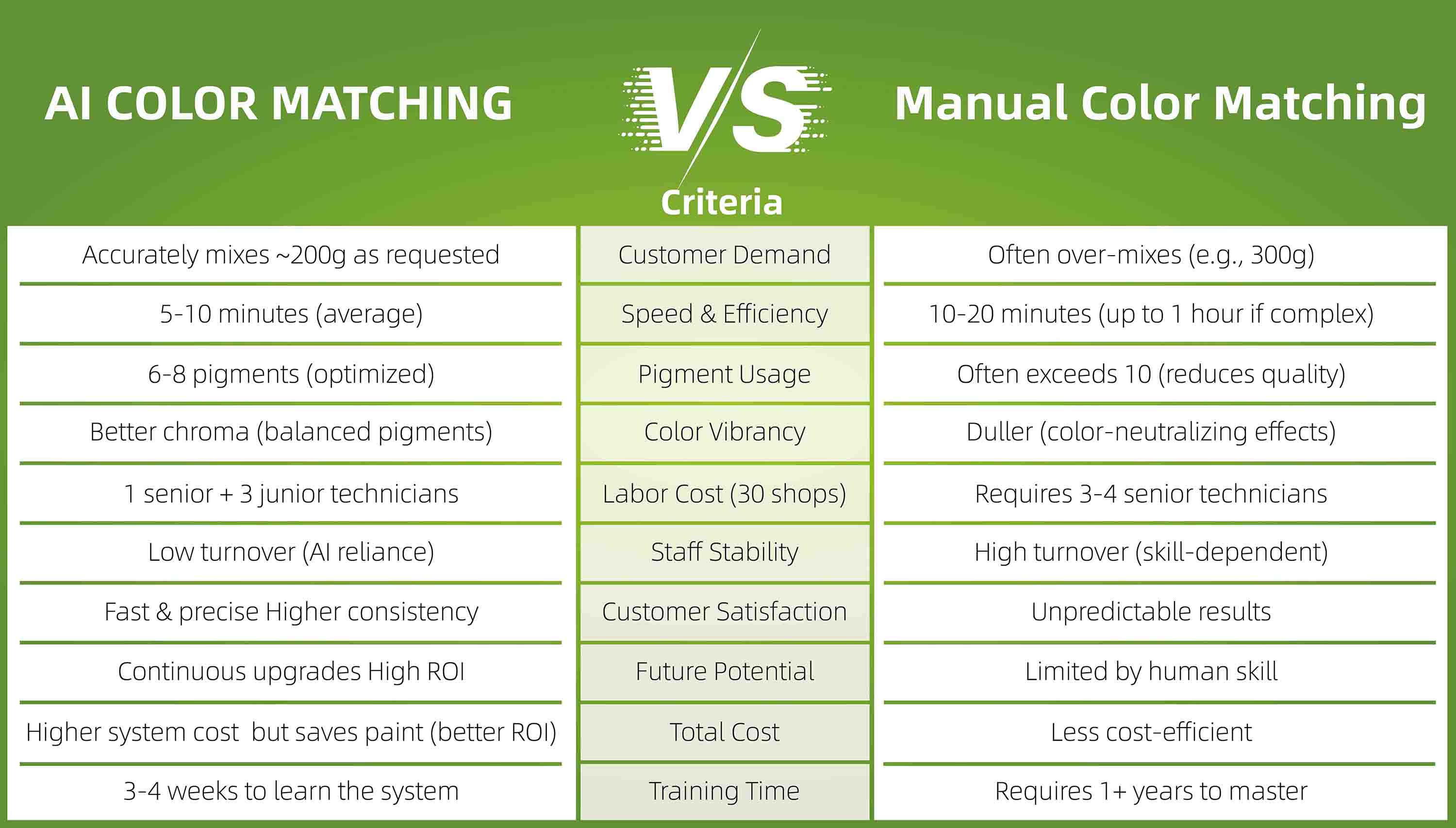 Os dados são claros: a correspondência de cores por IA traz melhorias mensuráveis em velocidade, precisão, eficiência de pigmentos, estabilidade da mão de obra e retorno do investimento a longo prazo. Embora a correspondência manual de cores ainda tenha seu lugar, especialmente em aplicações altamente personalizadas ou artísticas, a IA está se tornando rapidamente a escolha mais inteligente para oficinas de funilaria e pintura modernas que buscam operações escaláveis, confiáveis e econômicas.